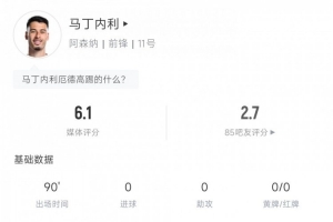 体育资讯4月30日讯 欧冠半决赛首回合,阿森纳0-1不敌巴黎。本场比赛,马丁内利首发打满全场,评分6.1分全场最低。